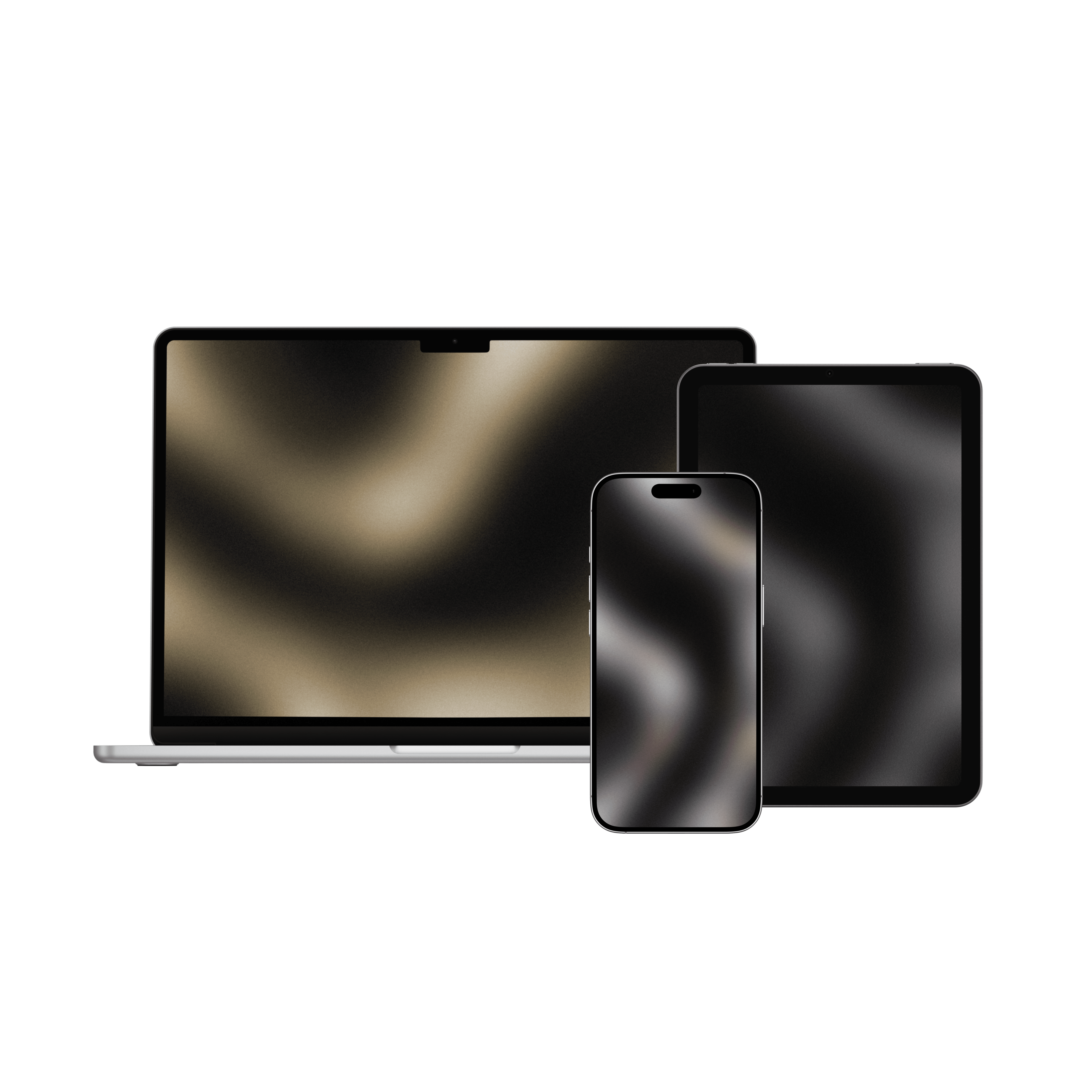 A pack of six high-resolution wallpapers featuring smooth abstract curves with soft blur and a subtle grain texture for a refined metallic feel. The collection includes three color variations: gold, grey, and iridescent.