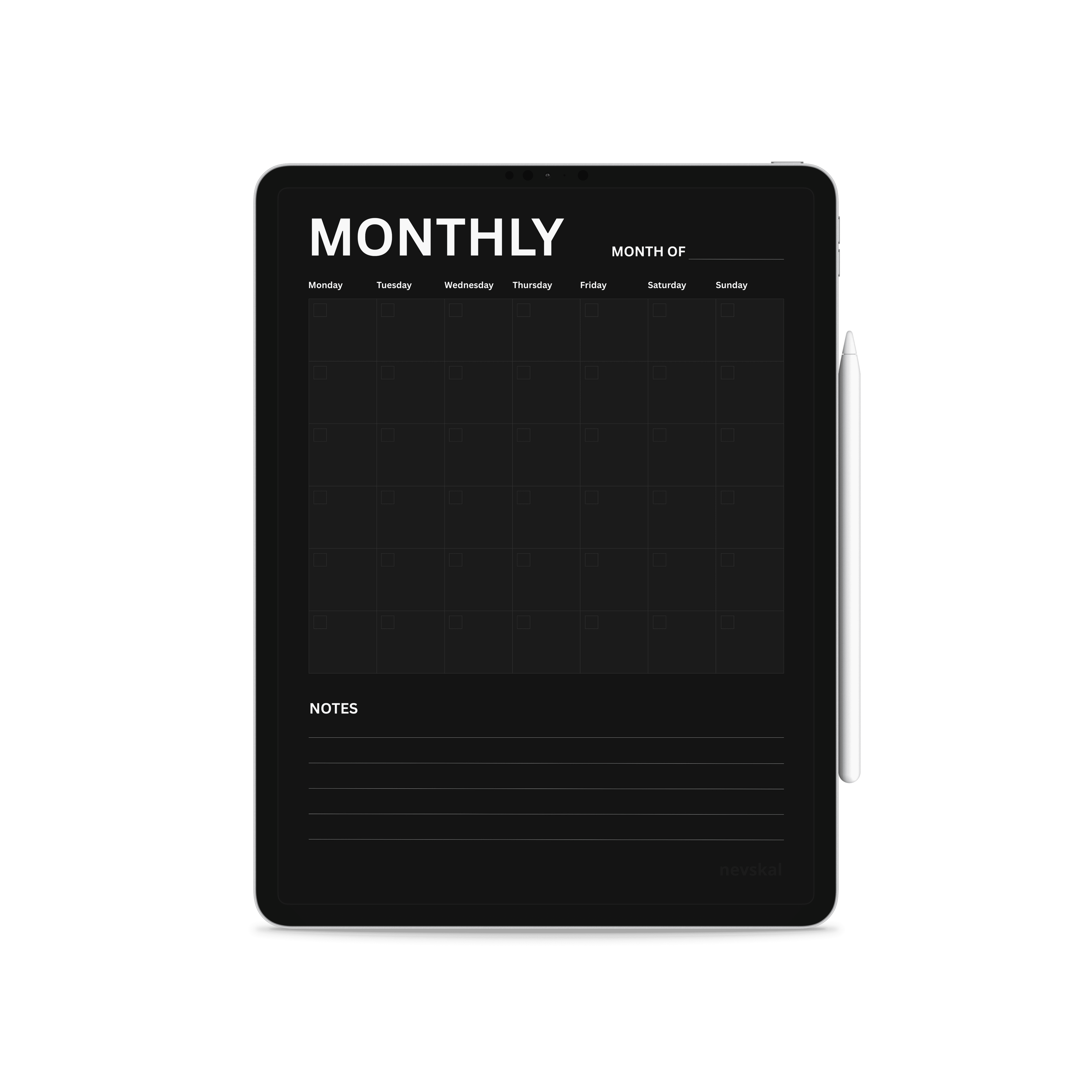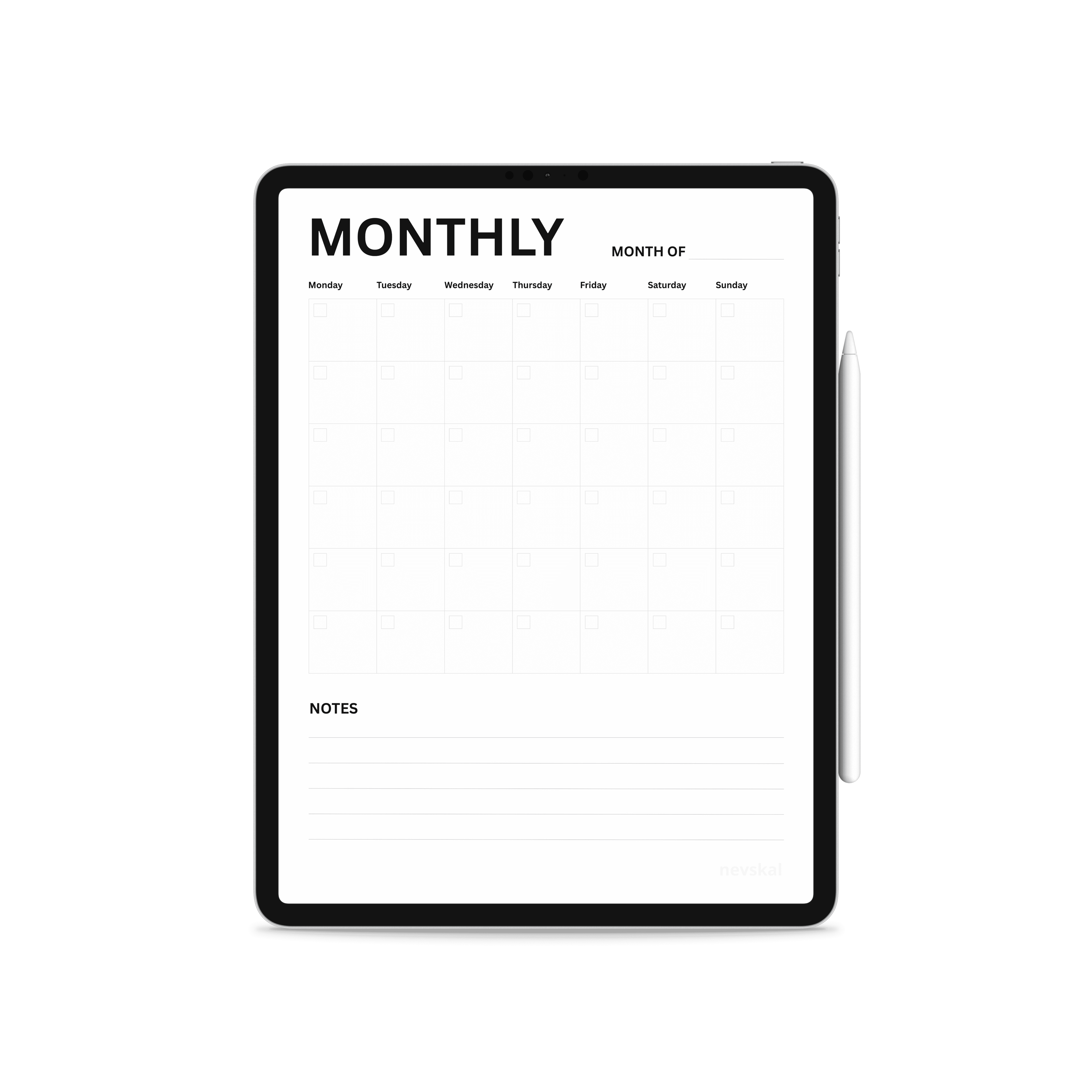A minimal and essential monthly planner designed to give you a clear overview of your entire month. Its clean and structured layout helps you plan ahead, stay organized, and keep track of important dates with ease. The planner includes a dedicated space for each day of the month, allowing you to write down appointments, tasks, and key events, along with a notes section for additional thoughts, reminders, or planning details. Created with a simple and distraction-free design, this monthly planner supports a more organized and intentional approach to your schedule. Perfect for both digital use and printing, it combines functionality and minimal aesthetics to help you manage your month with clarity and ease.